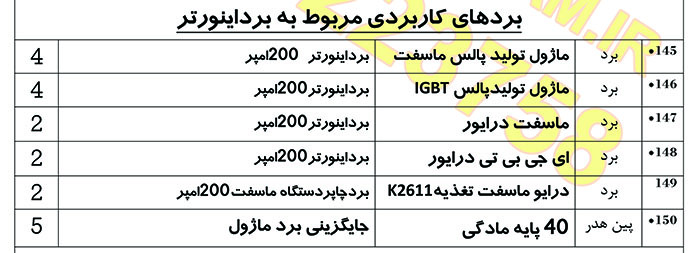 شما می توانید برای تهیه قطعات زیر و دریافت پیش فاکتور اصلی با شماره تلفن09153223758 بنام مهندس مقدم تماس گرفته و لیست مورد نیاز خود را تهیه نمایید.